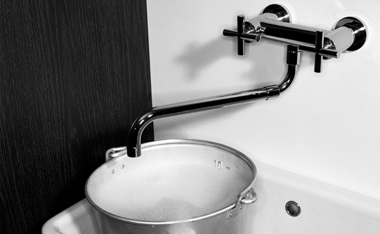 1998 年には、それまで培ったバスルーム金具のノウハウを活かし、キッチンのフィールドに進出。デザインと機能性が見事に融合したキッチン水栓を発表し、多くの高級キッチンメーカーに採用されました。 スプリング式のスプレーヘッドや、大きくアーチを描くスパウトの美しいラインなど、ドンブラハのトレードマークとも言えるデザインは、日本でも高い人気を誇ります。 デザインと機能・耐久性の融合というテーマが完成形となります。