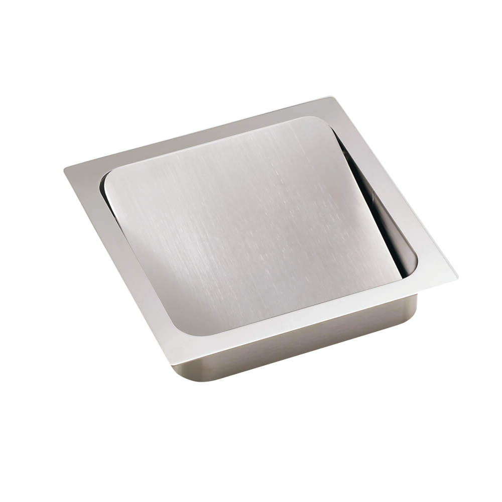 蓋の軸を中心からずらしているため、広い開口を実現しています。重り付きのため、使用後は蓋が水平な状態に戻ります。
