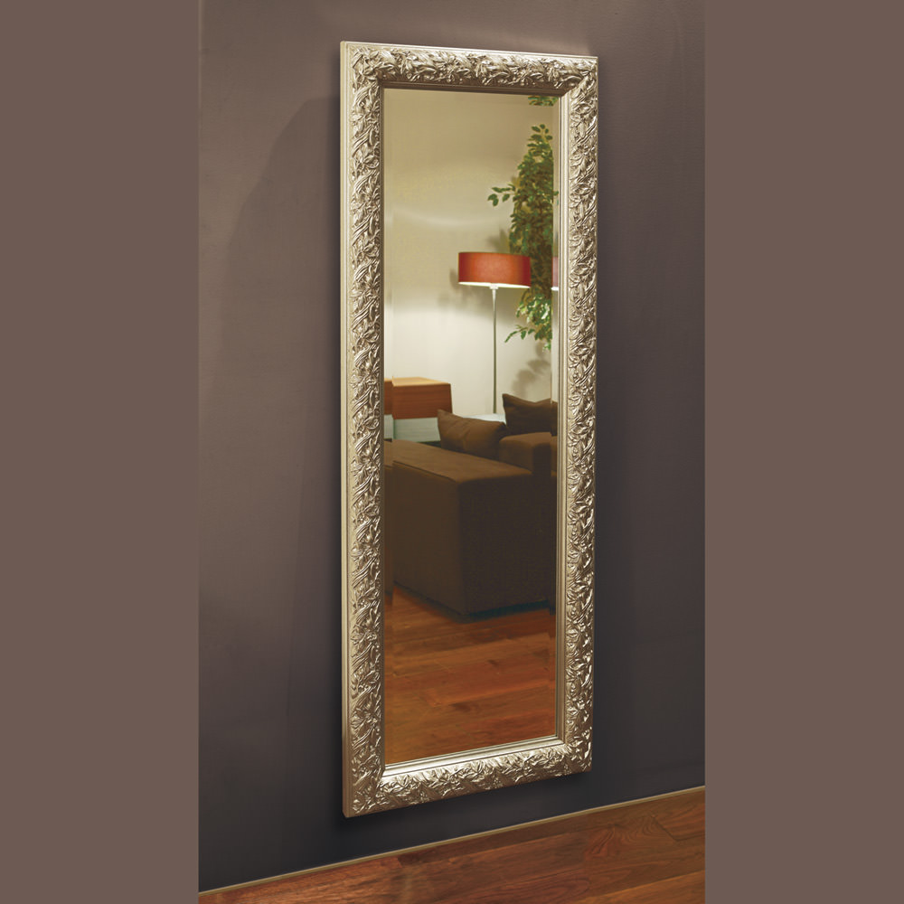 | 商品仕様 | ミラー取付方法についてはこちらをご参照ください フレーム巾95mm 木製(銀箔+アンティーク塗装) ミラー面取り巾25mm 吊り イタリア製 |