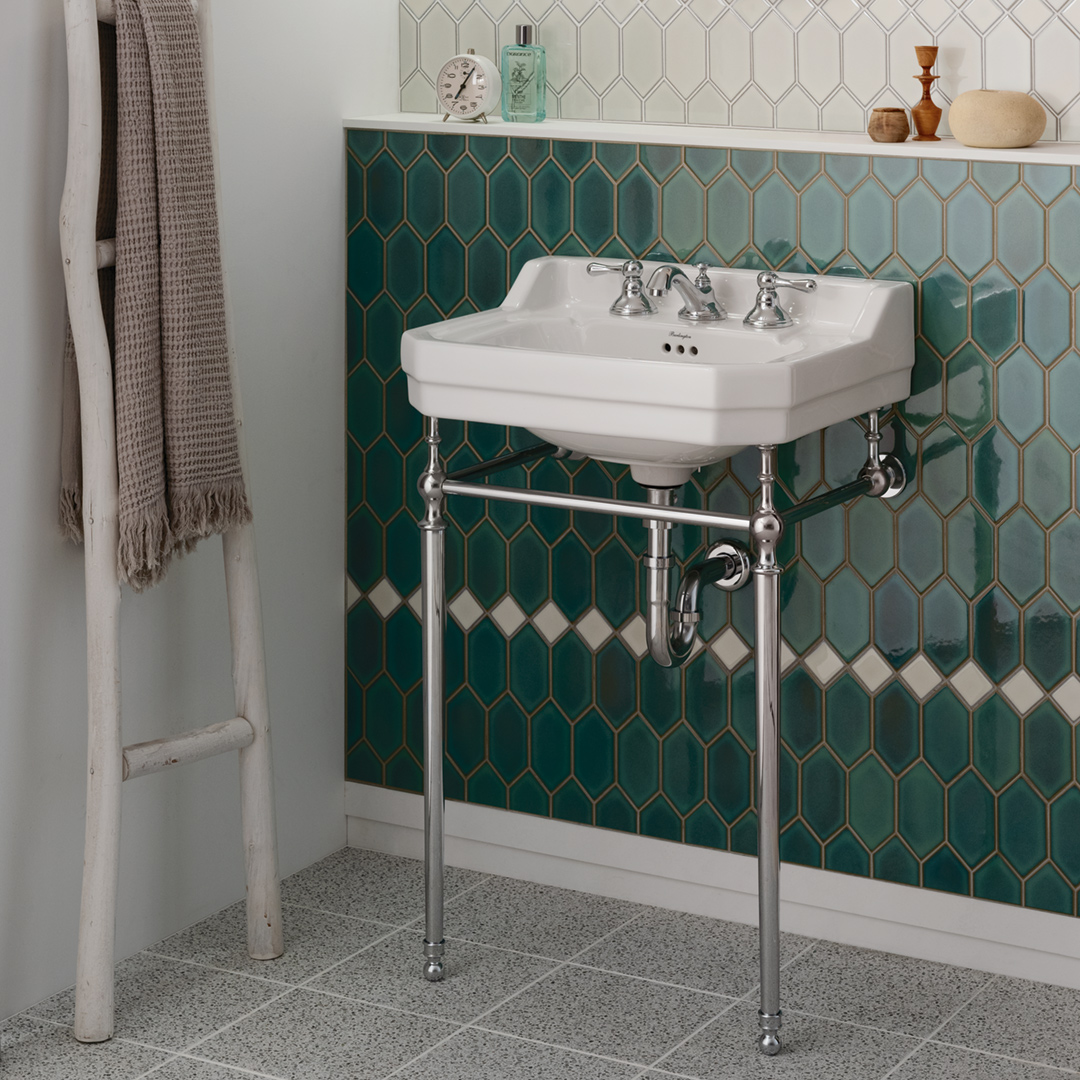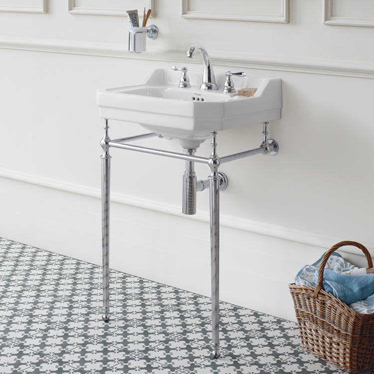 エドワーディアン洗面器は、イギリスのエドワード7世統治時代に流行した、ユニークかつ芸術的なデザインのバスルームから影響を受け、デザインされました。それまでの華美で豪華なヴィクトリアン時代とは一転し、エドワーディアンスタイルは、都会的で合理的かつ洗練されたクラシック。こちらのエドワーディアン洗面器もシンプルなラインを基調に、水跳ね防止のバックガードやソープ置きを備え、機能的なデザインです。クロムのコンソールスタンドと組み合わせれば、美しい英国様式の洗面台の完成です。スタンドを組み合わせない際は、壁掛けの洗面ボウルとしても機能します。