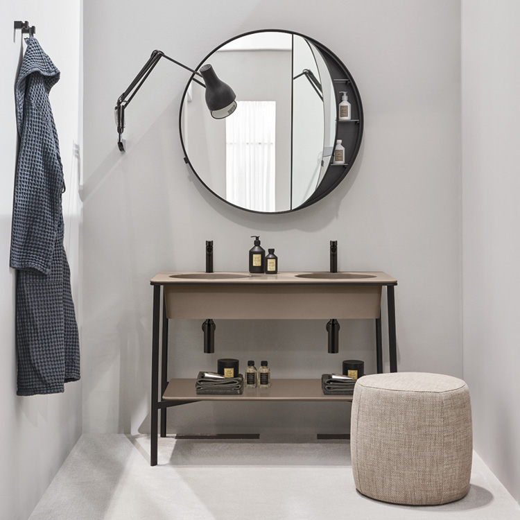 1100ミリのワイドな間口に、2つのシンクがついた洗面台です。スチールフレームにはめ込まれたセラミックのダブルボウルは家具を思わせる美しさです。セラミックと家具との融合を見事に体現し、Red Dot Design Award 2017でベストオブザベストを受賞しています。