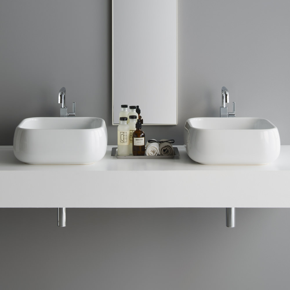 こちらは丸みを帯びた正方形フォルムのSHUI。小ぶりな400mmサイズは店舗スペースや、ゲスト用の手洗器に。