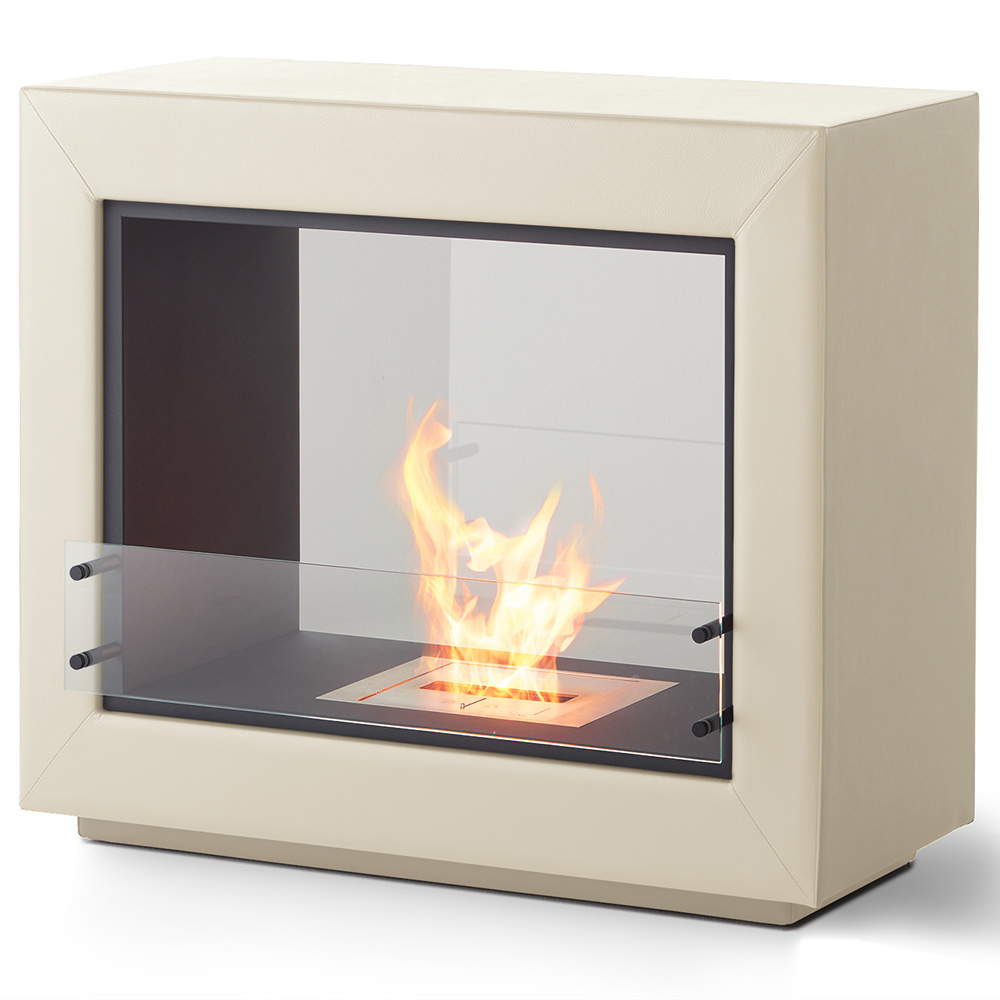 長方形の自立式二面開口型暖炉で、すっきりとしたモダンなラインが特徴です。後面には強化ガラスを使用し耐久性を高めています。