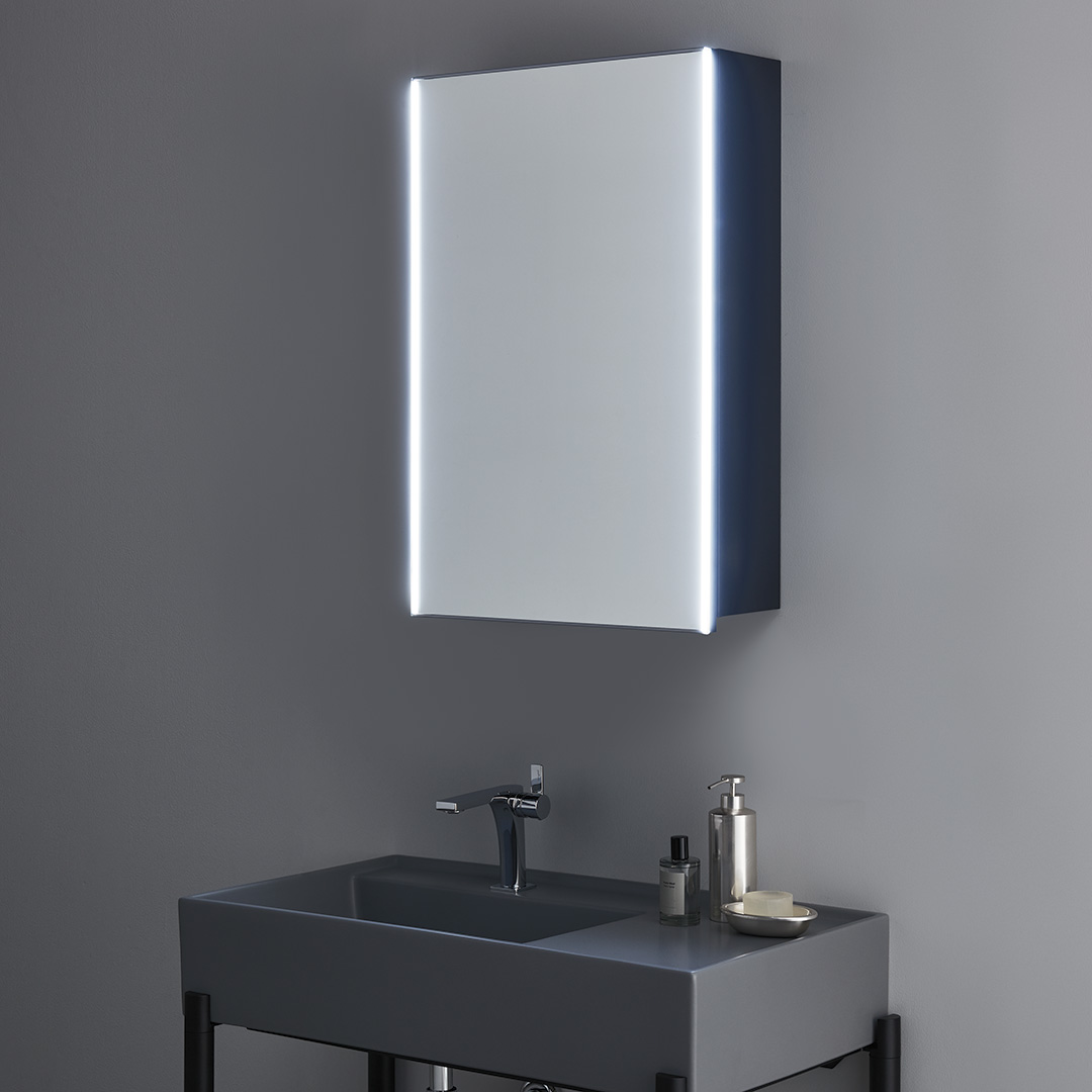 照明とミラーキャビネットが一体となったアクアピアオリジナルLEDキャビネットは、パウダールームに最適なプロダクトです。