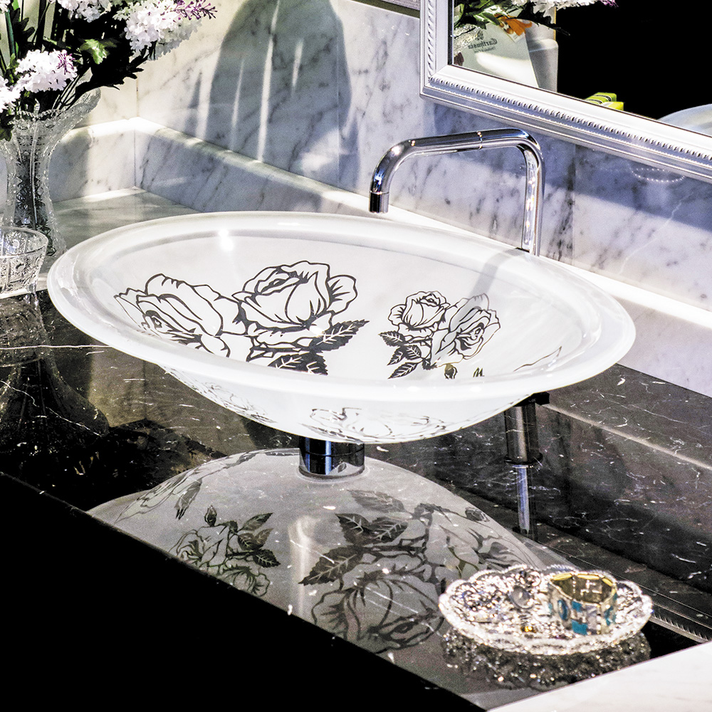 非常に高度なカッティング技術から生まれる洗面ボウルは、どの角度から見ても美しい輝きを放ちます。