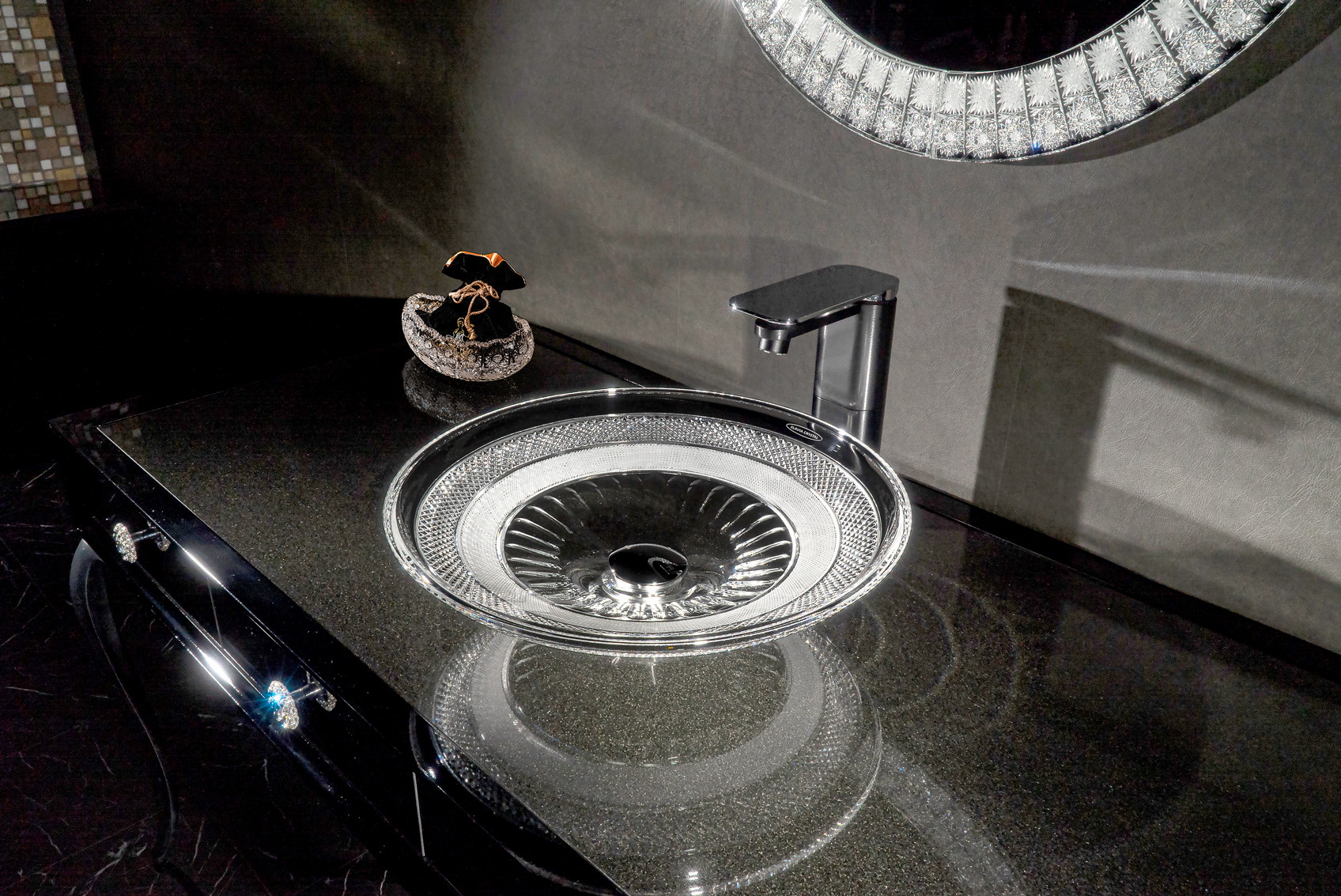 先祖代々受け継がれて来た伝統のボヘミアンクリスタルのカッティング技術による、繊細で美しい輝きは洗面スペースをゴージャスに演出します。
