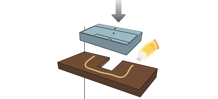 洗面器よりはみだした接着剤は素早く拭き取ってください。※一部のメーカーでこの段階で固定金具を使うものもあります。